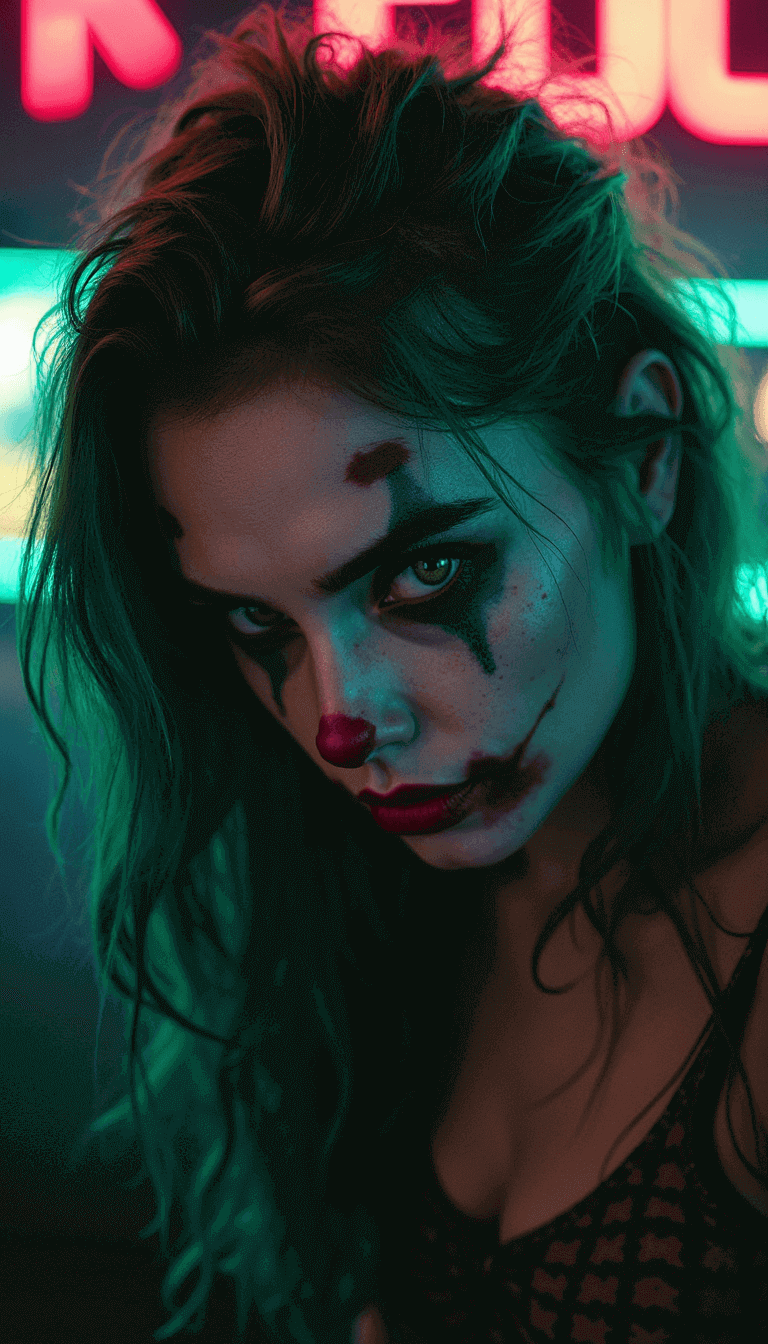 Alluring female Joker under neon lights, with messy green hair, smudged lipstick, and a mischievous glare for a striking PFP.