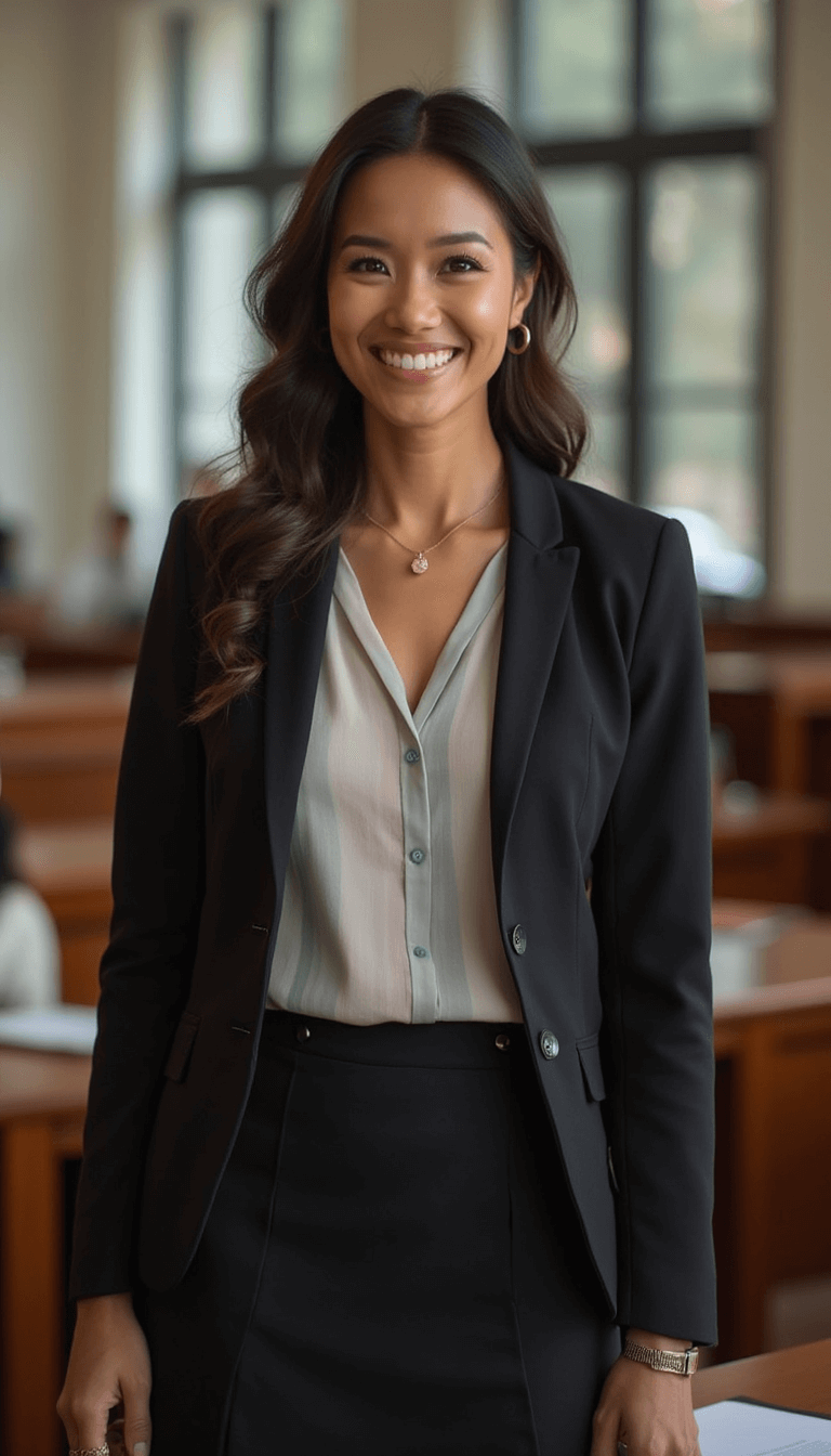 Discover a professional headshot featuring a warm, approachable demeanor with a genuine smile. Set in a modern courtroom, this portrait highlights reliability and empathy with a classic black blazer, tailored pencil skirt, pastel blouse, and tasteful accessories.