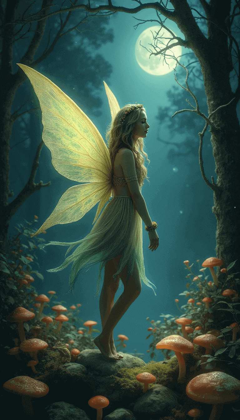 Bioluminescent forest guardian with vibrant wings, standing among softly glowing mushrooms under a magical moon.
