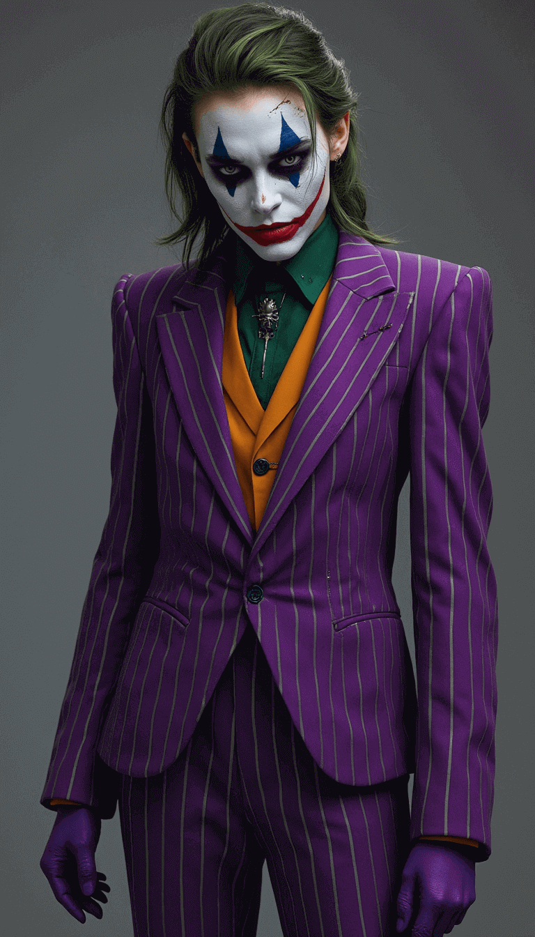 Chaotic Joker-style portrait of a female in purple-lime attire, ghostly face paint, and a haunting grin, perfect for an edgy Instagram PFP.