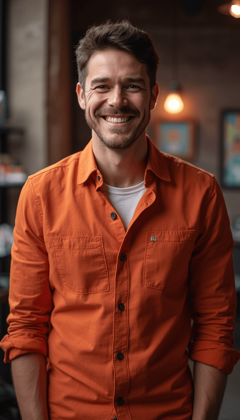 An actor with a warm, confident smile in a brightly lit studio, wearing a bold, solid-colored shirt, conveying charisma and stage presence.