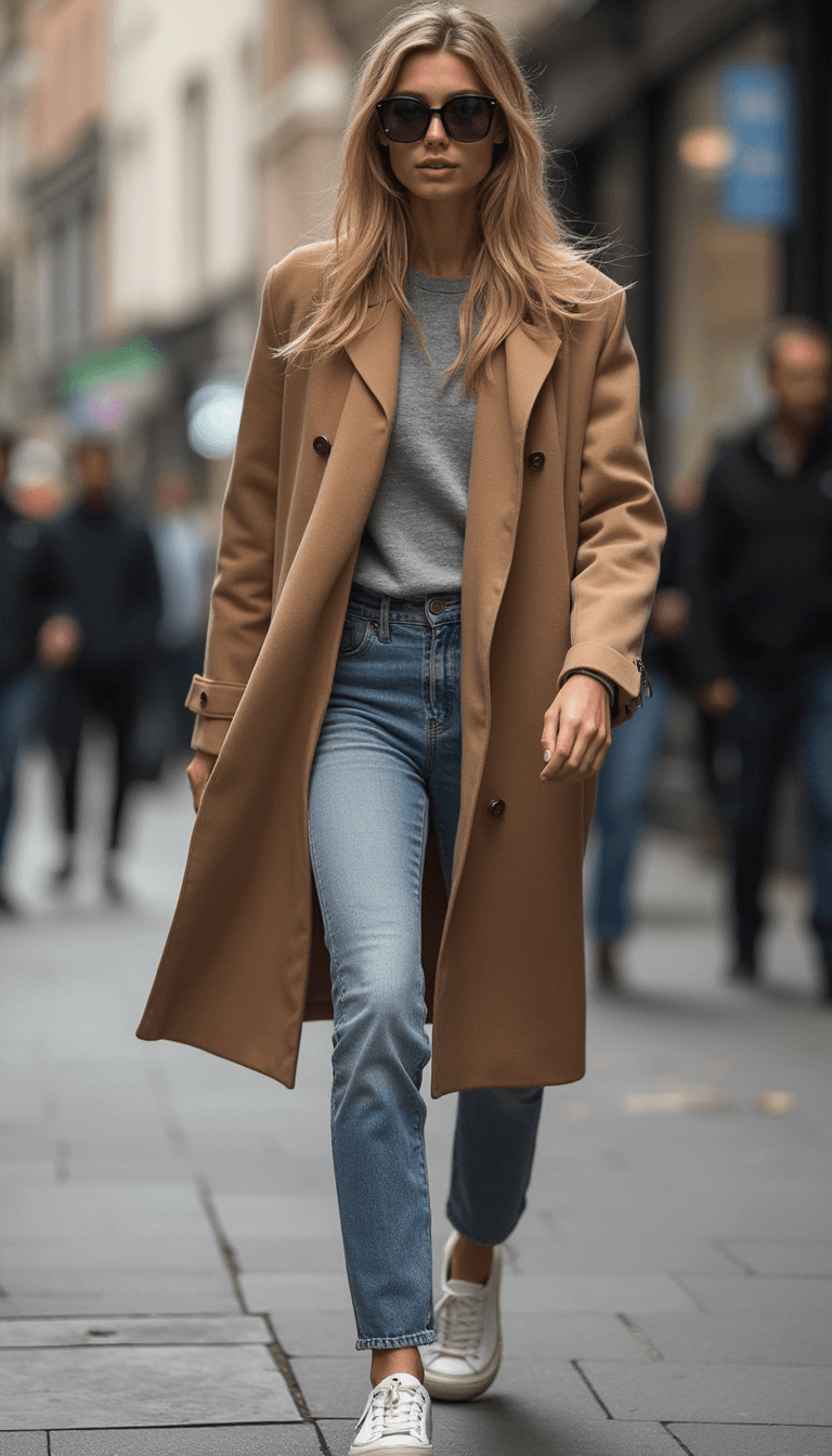 Effortlessly stylish street style portrait of a model in a long coat, jeans, and white sneakers, exuding casual sophistication.