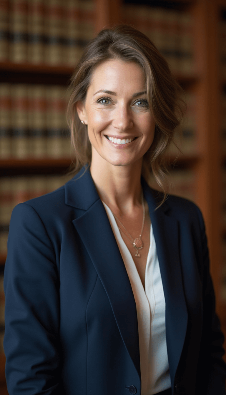 Explore a confident and professional headshot with an assertive smile and direct eye contact. Set against an elegant law library backdrop, this portrait highlights trustworthiness with a tailored navy blue suit, crisp white blouse, subtle jewelry, and a sophisticated hairstyle.