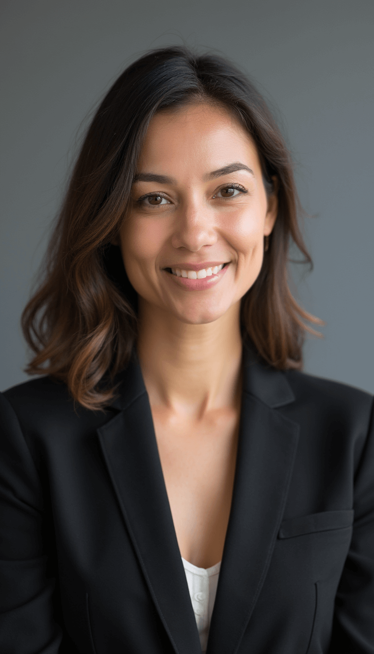 Professional headshot of a woman in a tailored blazer with a clean gray background and soft lighting emphasizing her poised expression.