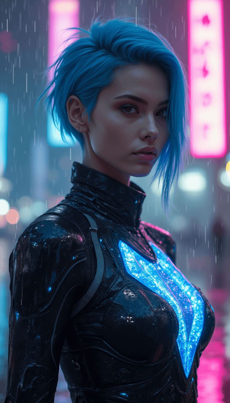 Futuristic cyberpunk avatar of a young woman with neon-blue hair styled in a sleek asymmetrical cut, wearing a glowing high-tech bodysuit with holographic armor plates, standing confidently in a rain-soaked cityscape illuminated by neon pink and blue signs.