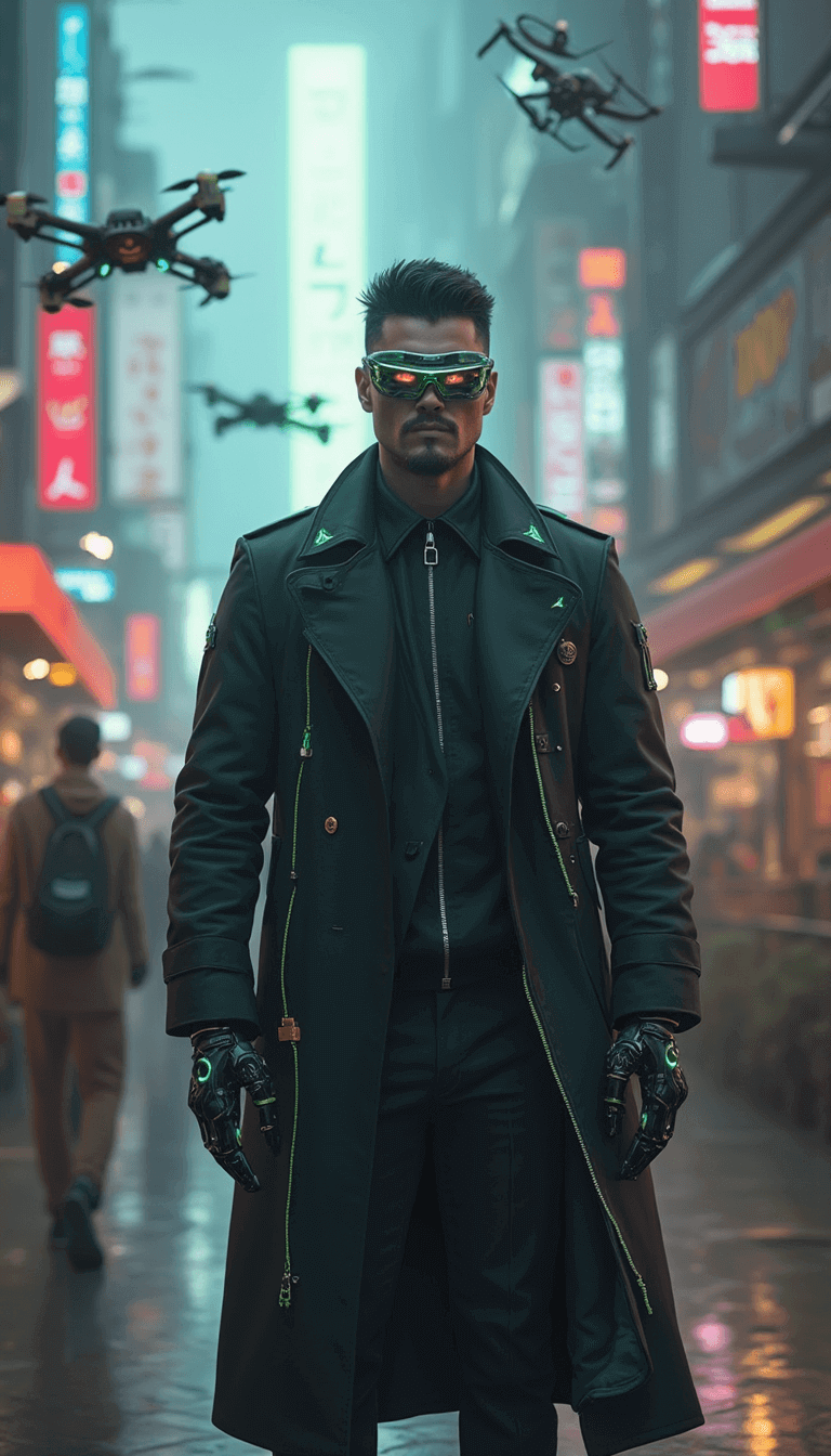 Full-body cyberpunk portrait of a man with robotic arms, a glowing visor over his eyes, and a black trench coat with neon green accents, standing in front of a bustling futuristic marketplace filled with holograms and flying drones.