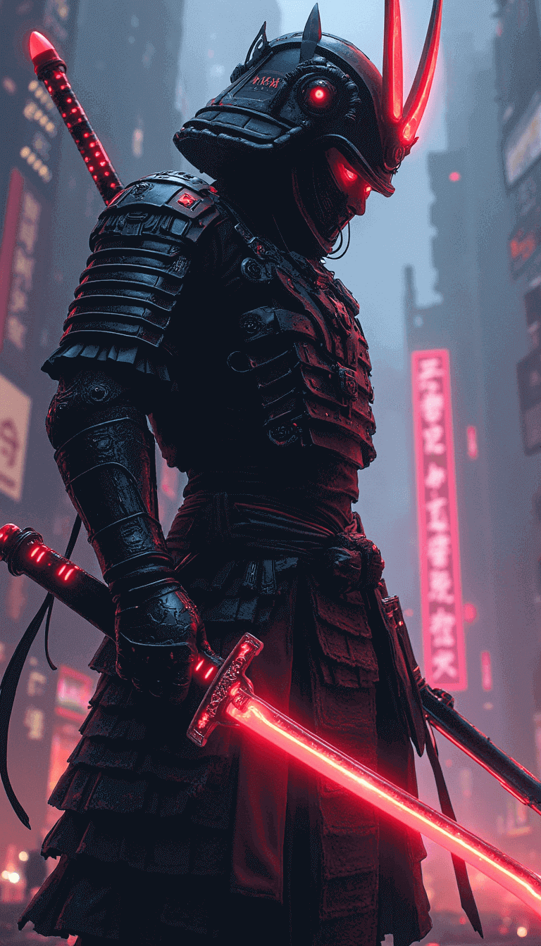 Futuristic samurai warrior armed with a neon katana, clad in glowing armor against a dystopian city skyline