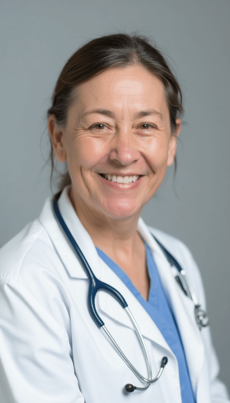 A professional headshot of a doctor in their 40s, wearing a white lab coat and a stethoscope around their neck. The background is light gray with soft lighting, emphasizing a calm and approachable demeanor. The doctor has a warm, reassuring smile, suitable for a clinic or hospital profile.