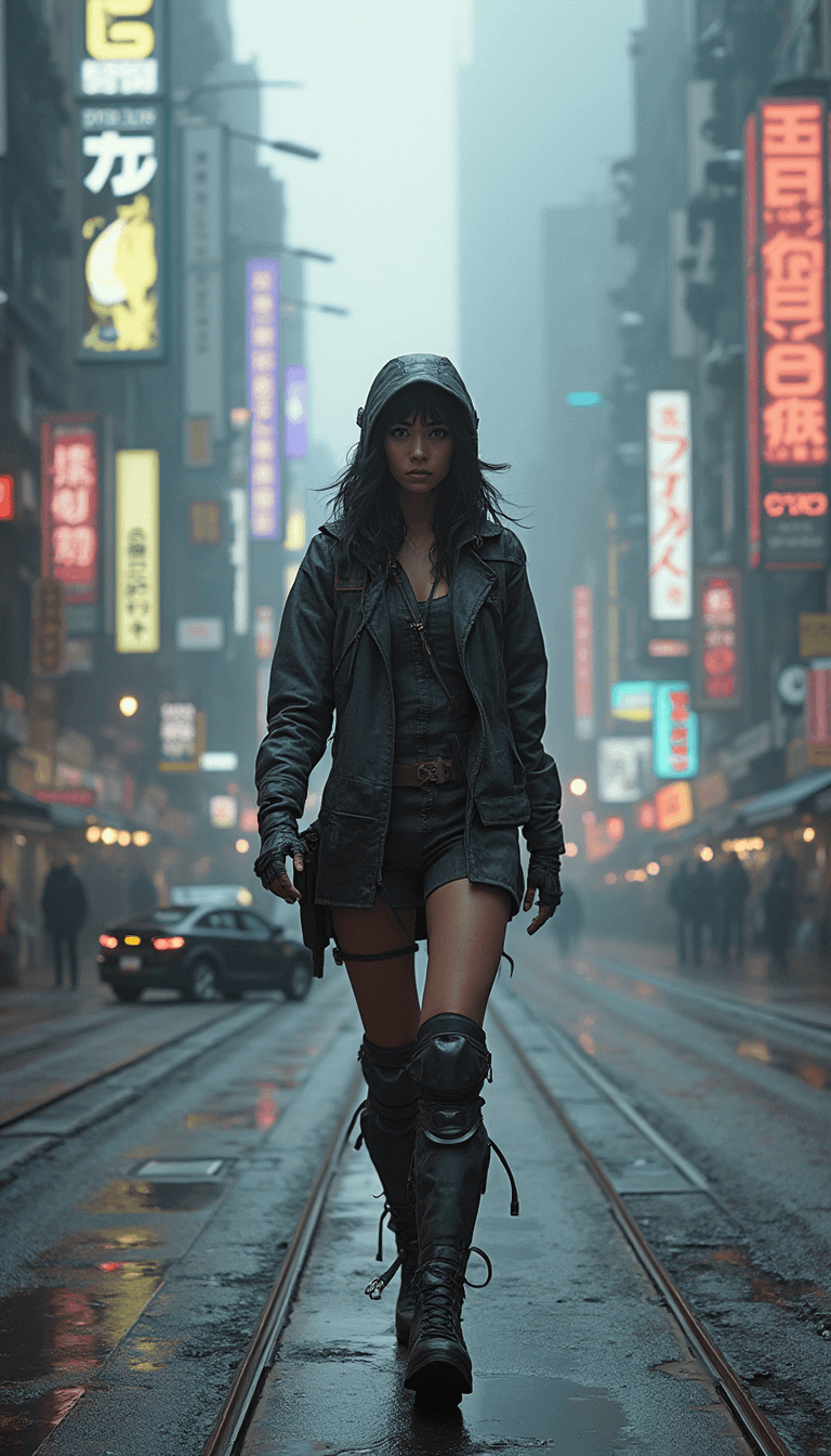 A sultry cosplay model dressed as a futuristic warrior, wearing revealing black leather lingerie with metallic accents, thigh-high boots, and glowing neon accessories, holding a sleek weapon, posed confidently in a sci-fi-inspired environment with glowing holograms.