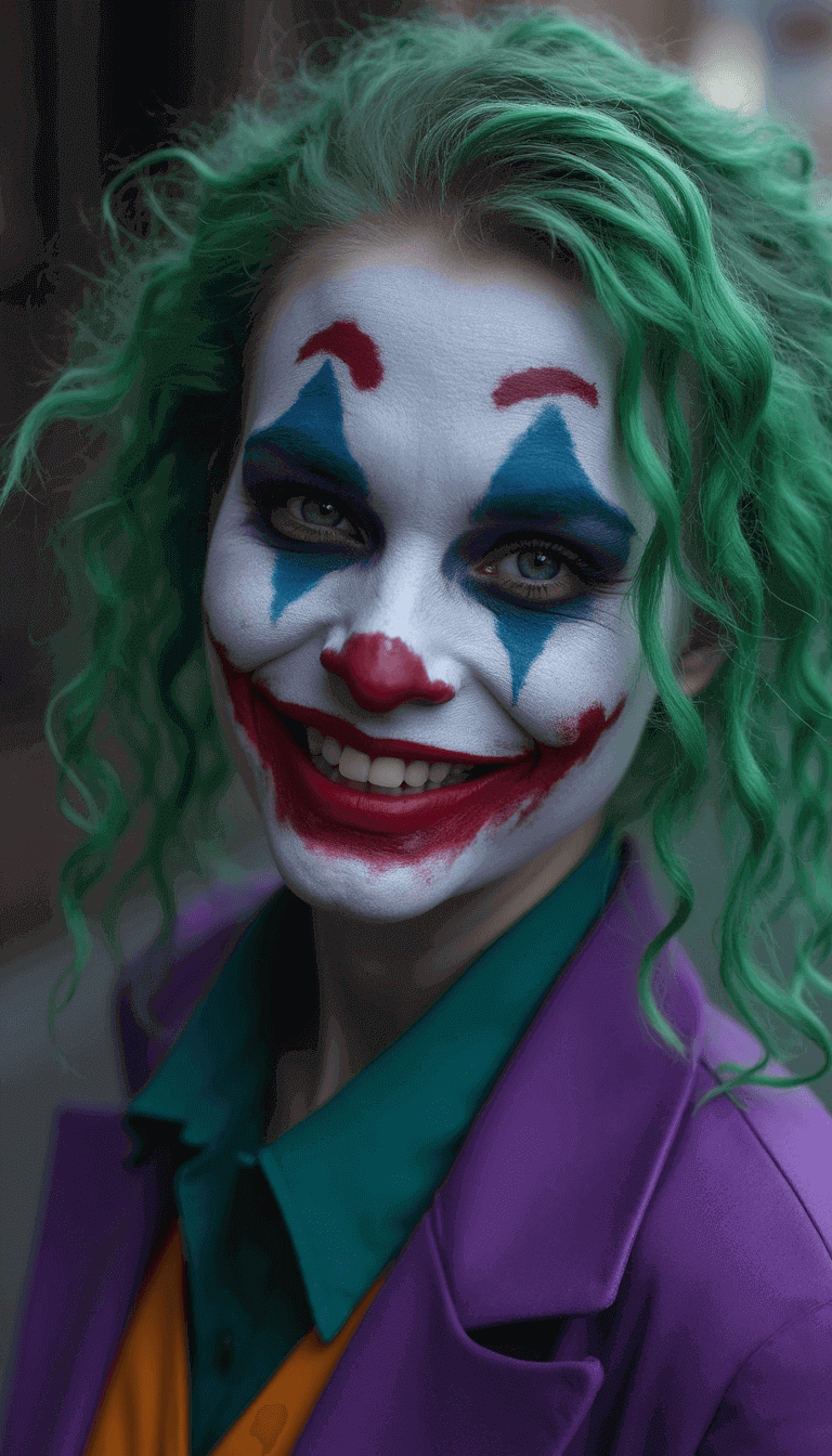 Craft a Joker PFP-inspired image of a female figure in striped purple suit, sporting cracked white makeup, and wild eyes.