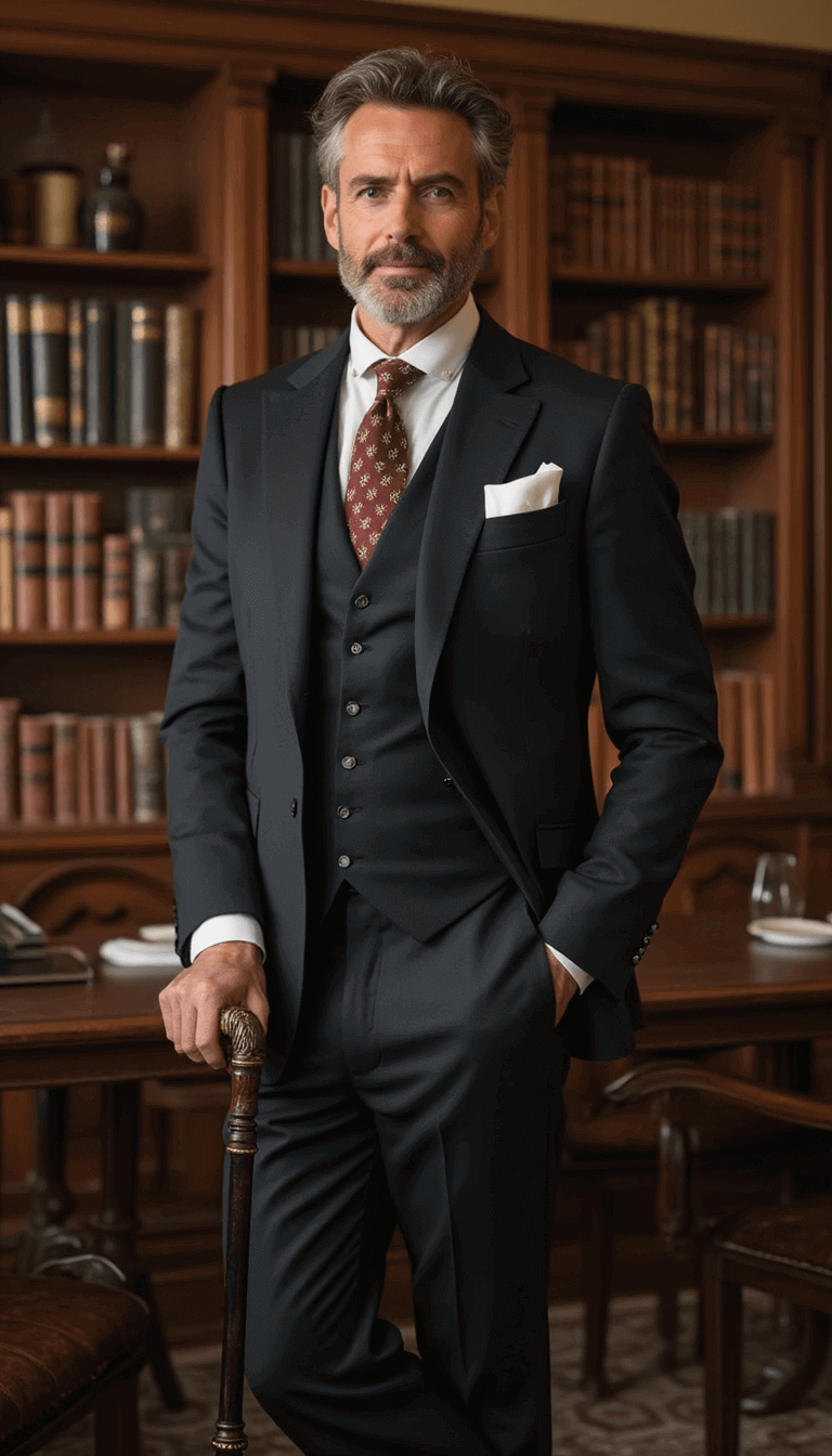 A man in a perfectly tailored three-piece suit with a pocket square, holding a vintage cane, posing in a library filled with antique books and warm wood tones, with an aura of refinement and wealth.