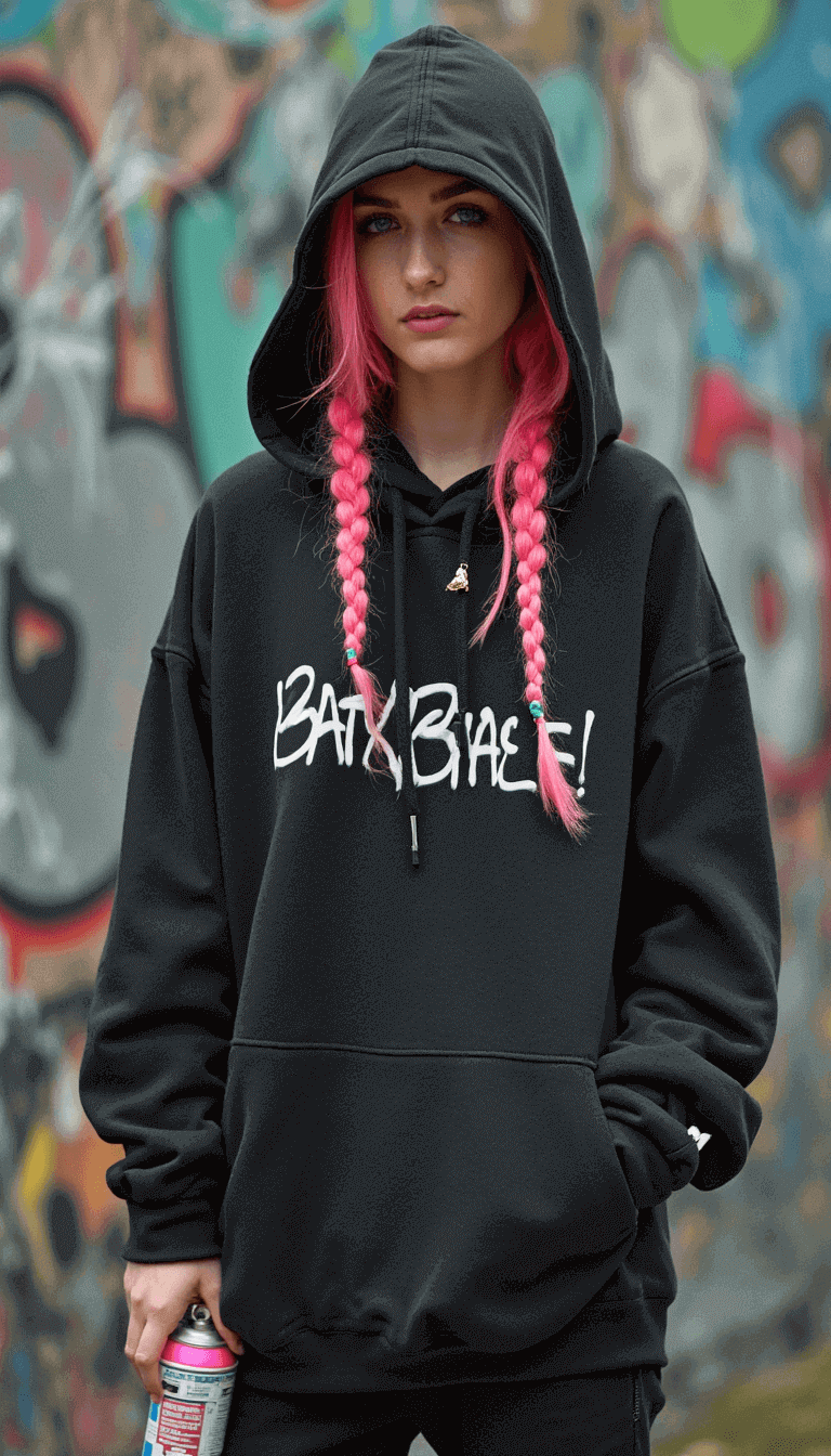 Bold urban avatar of a woman street artist with neon braids, oversized hoodie, and graffiti backdrop, ready to paint.