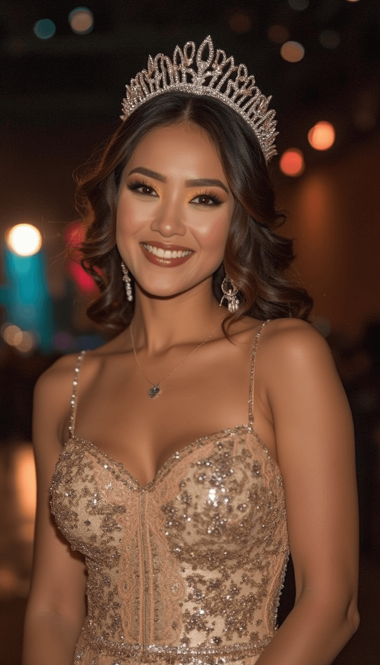Experience a regal and glamorous headshot with a confident, elegant gaze and subtle smile. Featuring a golden glow background with sparkling effects, a silver sequin gown, diamond tiara, and delicate drop earrings, this portrait embodies sophistication and grace.