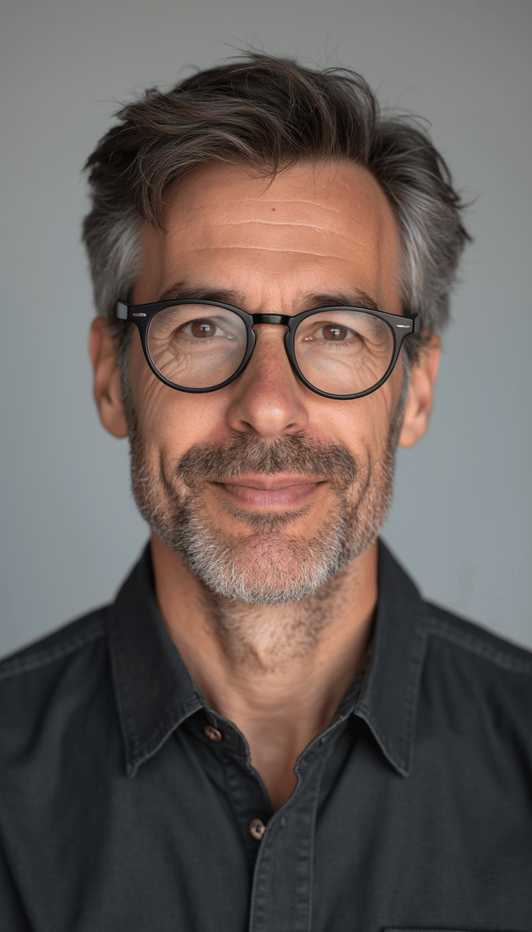 A versatile acting headshot of a middle-aged actor with glasses, a neutral expression, and minimalistic styling. Soft lighting on a plain gray background showcases adaptability for various roles
